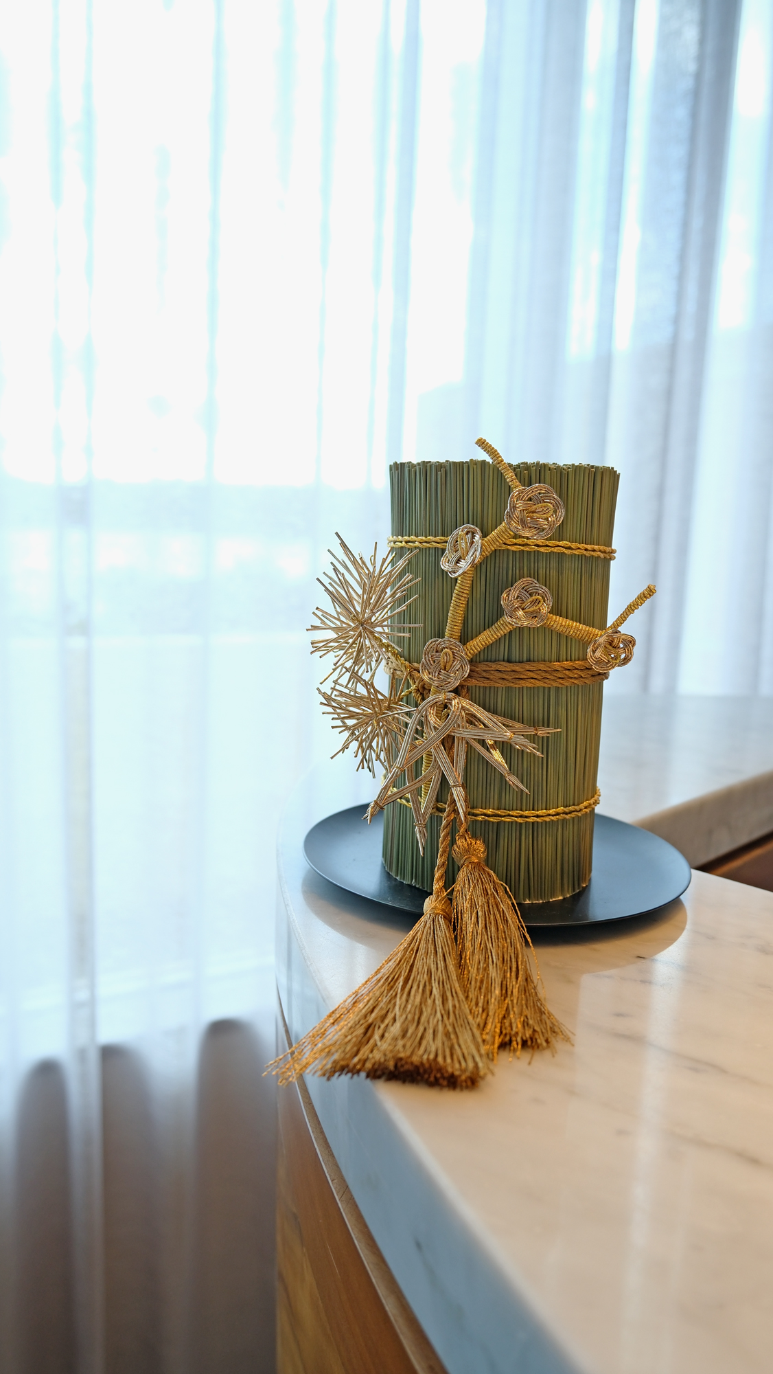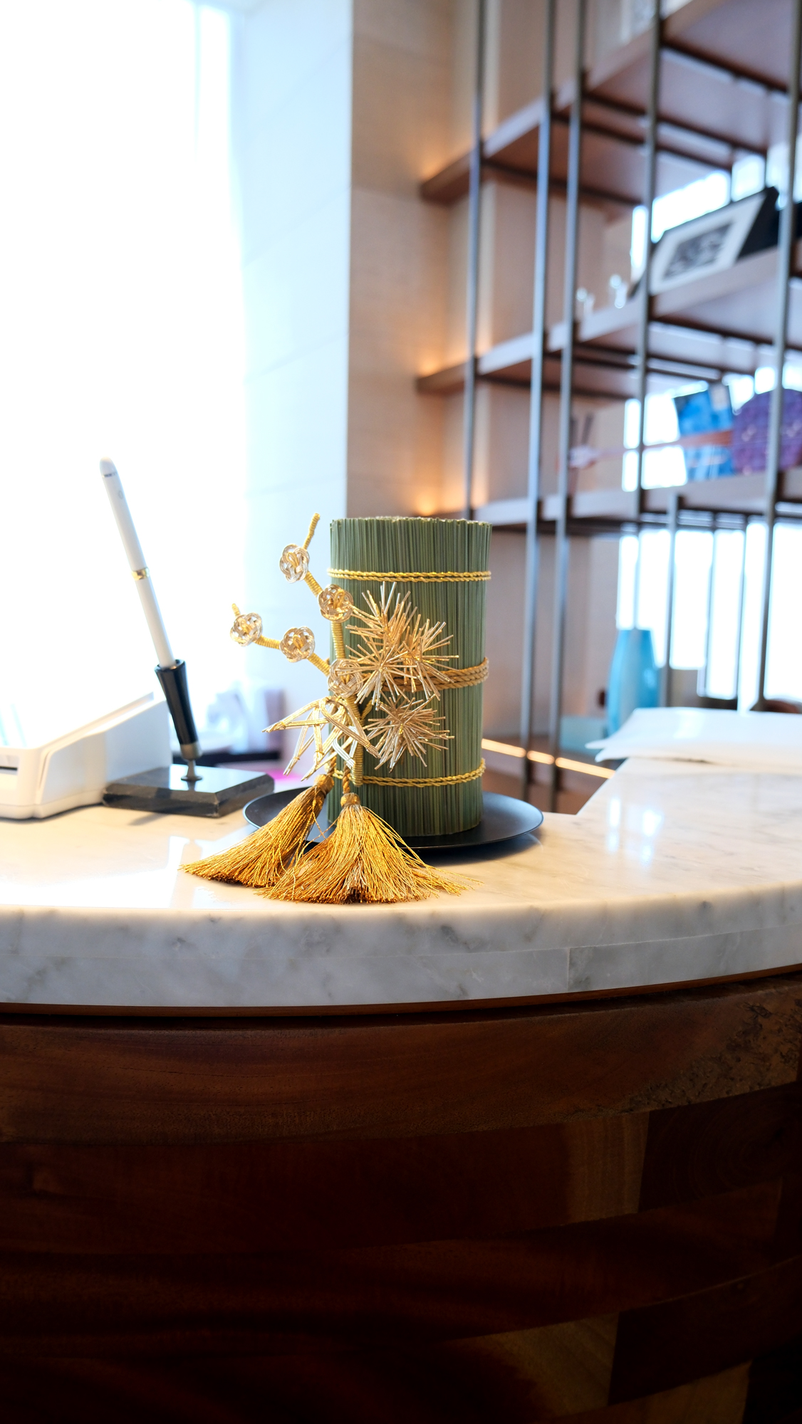 ゴールドの松竹梅をあしらった小さない草の門松はレセプションカウンターに飾らせていただきました。ラウンジ内のフレグランスを邪魔しないほのかな香りでお客様をお出迎えいたします。